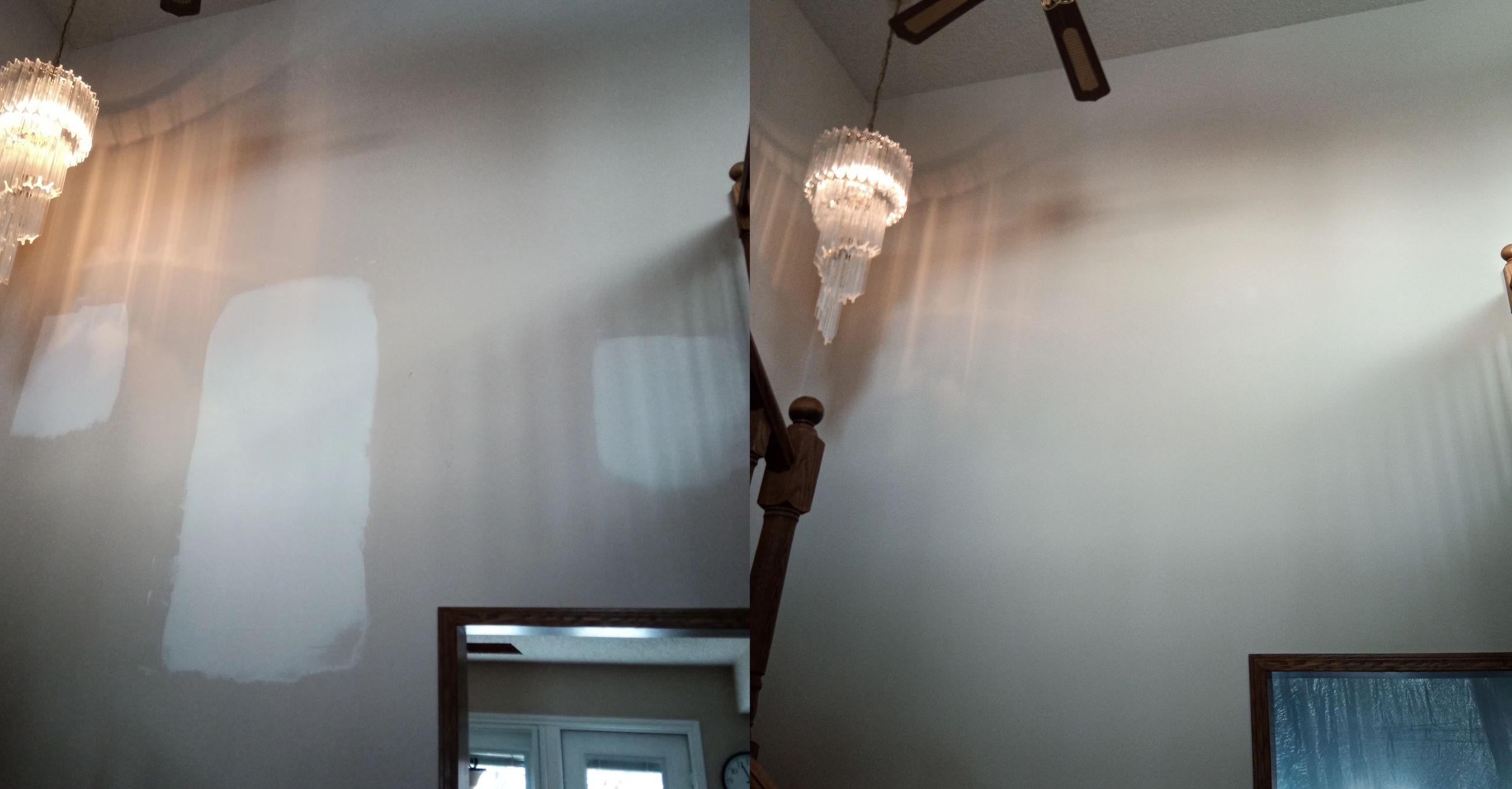 Cathedral ceiling ajacent wall on stairwell: paint blend.